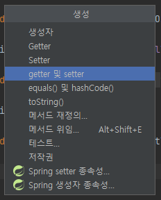 getter 및 setter 클릭 후 get, set 생성 할 변수 선택(전체 선택은 Ctrl + A) 후 확인 누르면 자동으로 get, set이 만들어진다.