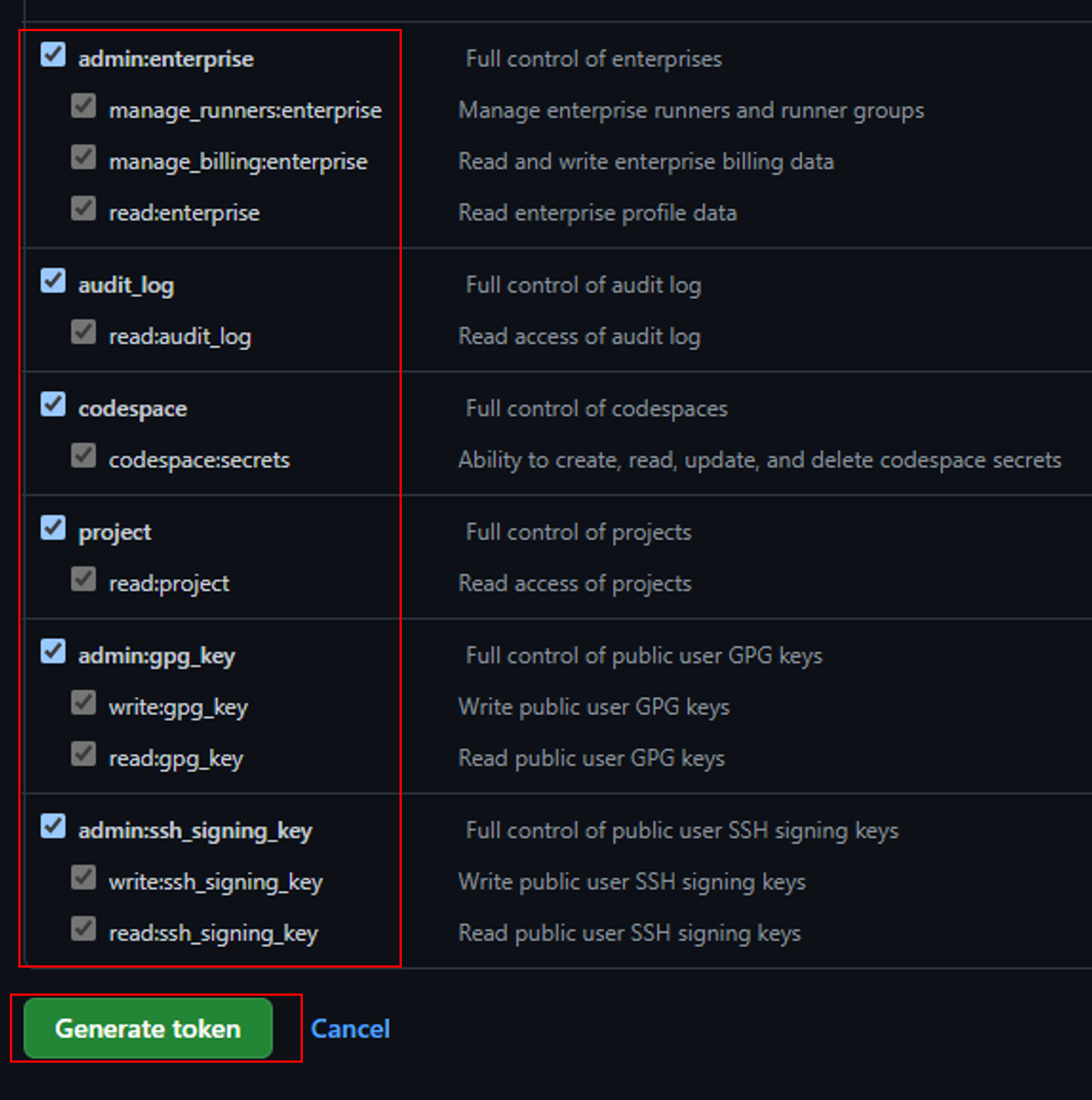 6. 권한은 전체 체크 후 Generate token 생성