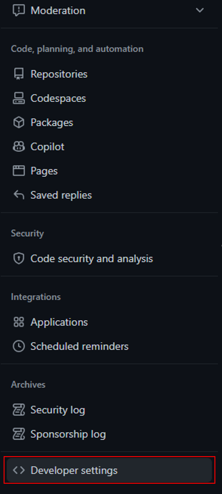 2. 왼쪽 메뉴 하단에 있는 Developer settings 이동