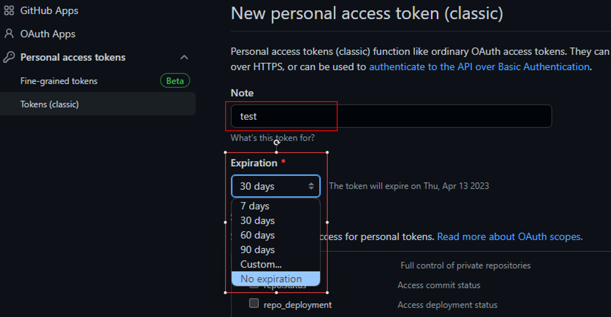 5. Note에 토큰 명을 작성하고, Expiration(토큰 유효 일)은 본인이 편한대로 선택하면 된다.