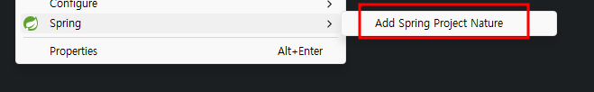 다시 프로젝트 마우스 오른쪽 클릭 후 Spring > Add Spring Project Nature 클릭하면 Spring에서 에러표시 나는 버그 현상들이 사라진다.