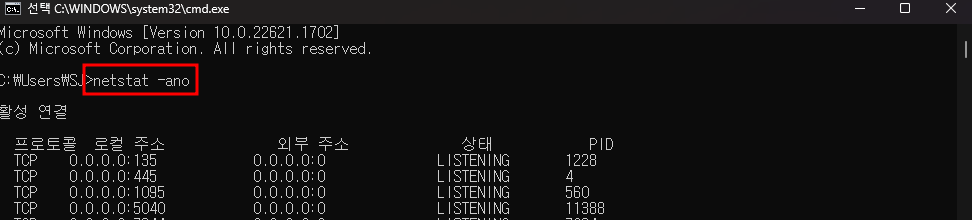1. 윈도우 cmd창을 열고(윈도우 + R버튼 실행 후 cmd라고 치면 cmd창이 열림) 1099에 해당하는 PID 찾기를 위해 cmd창에서 netstat -ano 라고 작성하고 실행