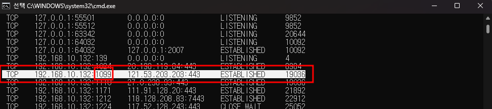 잉? 나 방금 컴퓨터 켰는데... 어떻게 1099포트가 사용 중이라고 나오지?