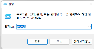 1. 실행 대화 상자(단축키 : Windows + R) 열고 regedit이라고 작성 후 확인버튼 클릭