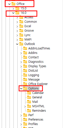 2. Outlook 2016/2019 기준 KEY_CURRENT_USER > Software > Microsoft > Office > 16.0 > Outlook > Options
