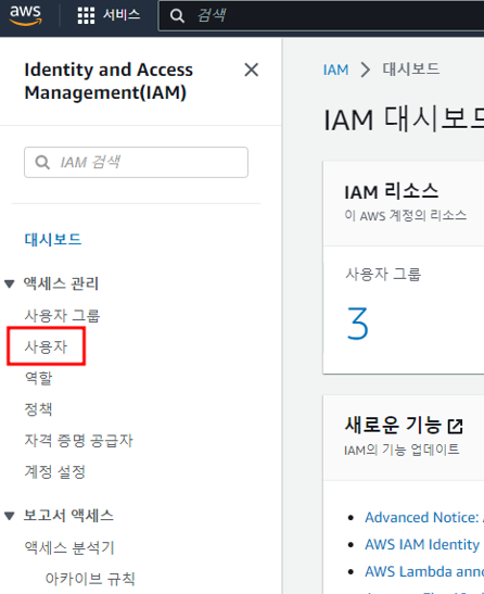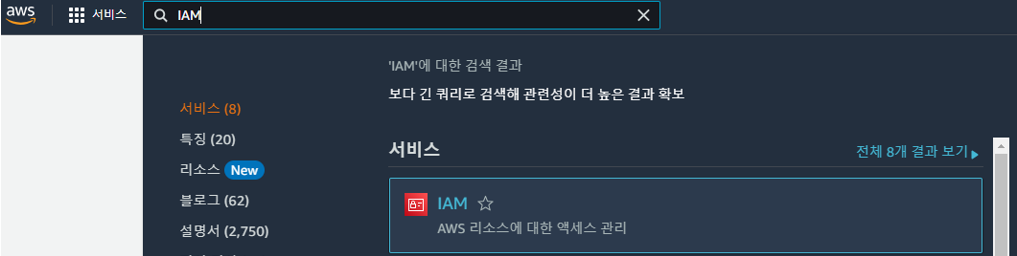 1. AWS 콘솔에 로그인 후 검색 창에 'IAM' 이라고 검색 후 나오는 IAM 서비스 클릭