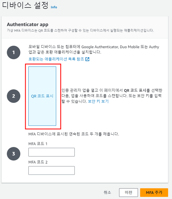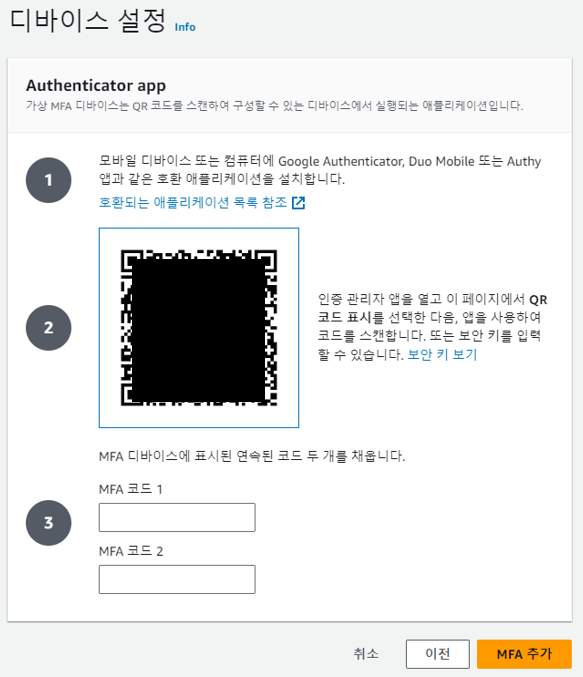 8. 6자리 코드가 나오기 시작하면 첫번째 나온 숫자를 MFA 코드1에 넣어주고 시간이 지나면(30초 정도) 코드가 바뀌는데 그 다음에 나온 코드를 MFA 코드2에 넣어주고 MFA추가 버튼 클릭하면 끝이다.